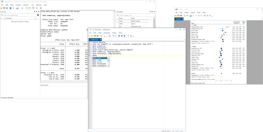meta là lệnh mới của Stata để thực hiện phân tích meta. meta có các câu lệnh con. Sau khi meta được gỏ, nó sẽ hiển thị một danh sách xổ xuống để chọn các lệnh con. Chúng ta có thể bỏ qua danh sách và tiếp tục gõ.
