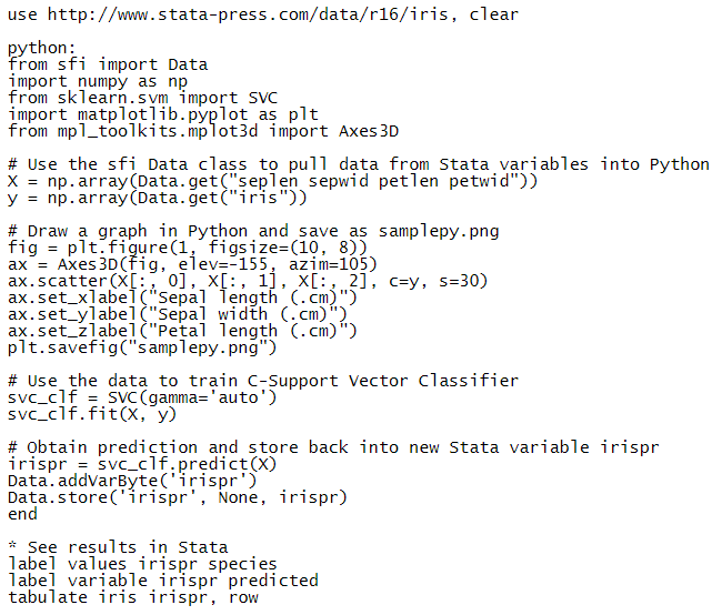 Trong Stata 16, bạn có thể nhúng và thực thi mã Python từ Stata. Lệnh python mới của Stata cung cấp một bộ các lệnh con cho phép bạn dễ dàng gọi Python từ Stata và xuất kết quả Python trong Stata. Stata 16 hỗ trợ cả Python 2 và Python 3 bắt đầu từ Python 2.7.