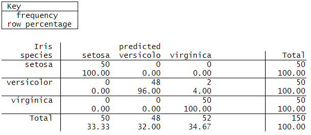 - Quay lại Stata, gắn nhãn giá trị của iris lên irispr và sử dụng lệnh tabulate để hiển thị bảng phân loại.