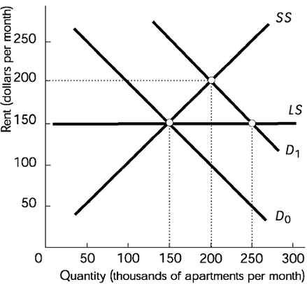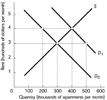 14. In the figure above, if the demand for apartments increases from D0 to D1 and the market is unregulated, in the long run the number of apartments rented will