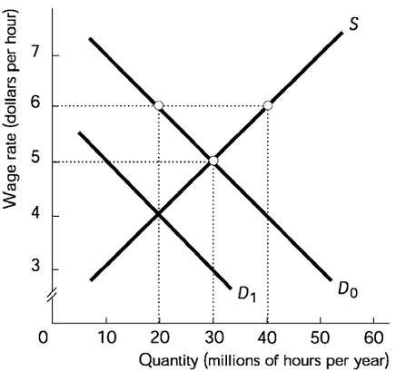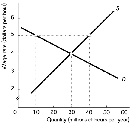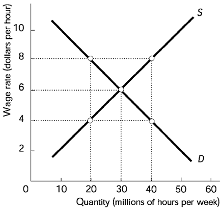 117) In the above figure, if the minimum wage is set at $6 per hour, the level of unemployment in millions of hours per week is