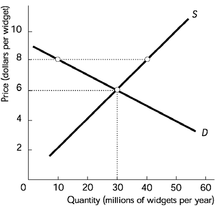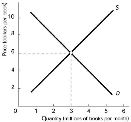 127) In the above figure, the equilibrium price of a paperback book is $6 per book and the equilibrium quantity is 3 million books. The National Literature Board convinces the government to impose a price ceiling of $6 per book. At this price, the quantity of books supplied to the market will be