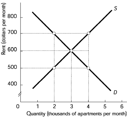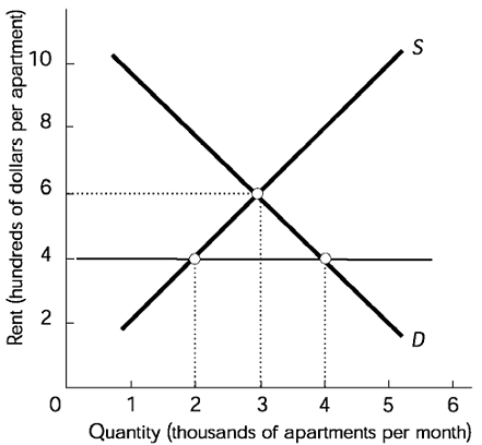 128) The figure above illustrates a rental housing market in which there is a rent ceiling of $400 a month. The rent ceiling is strictly enforced. The number of apartments rented is